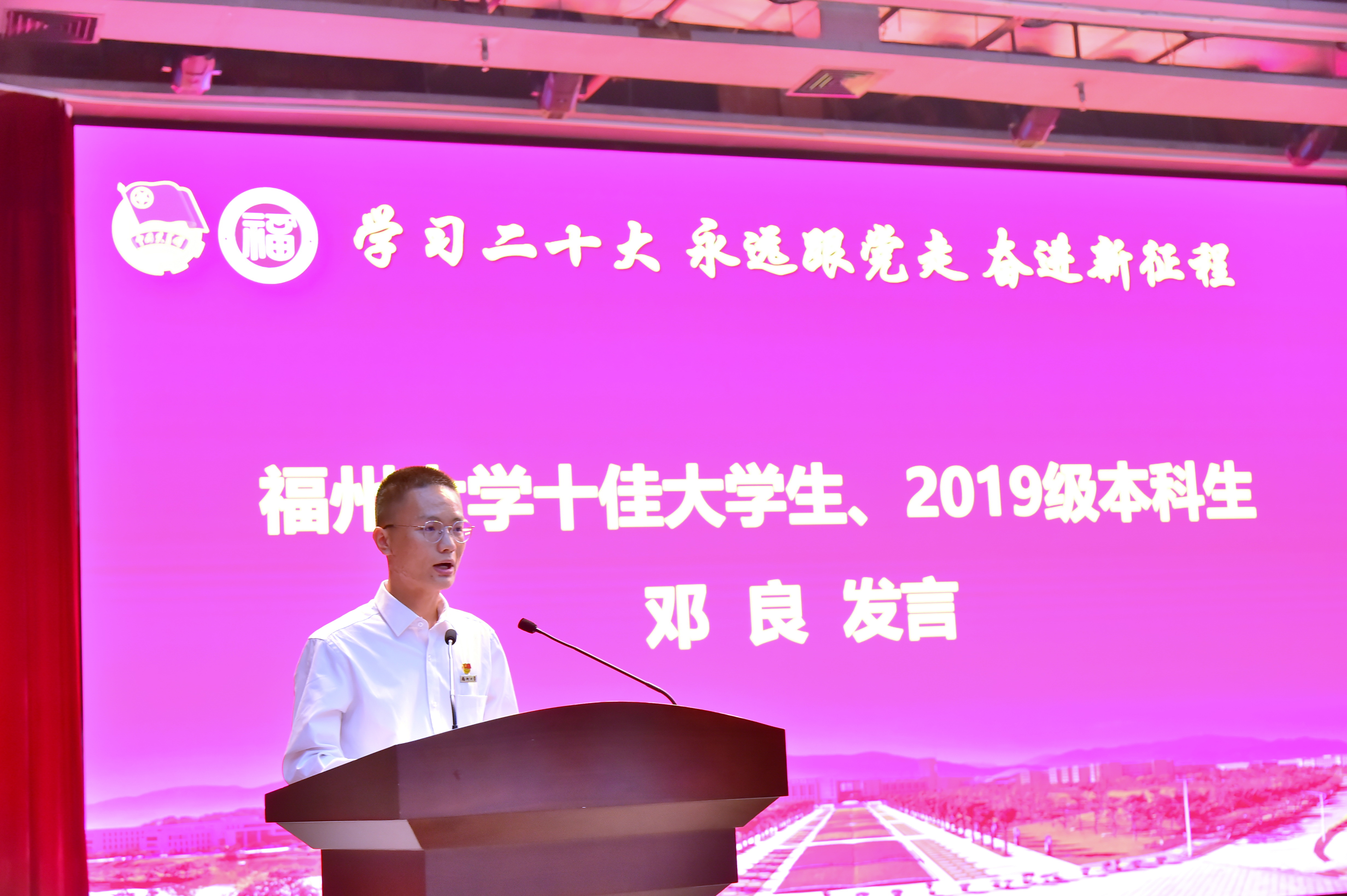 荣获福州大学十佳大学生称号、本科生国家奖学金获得者、保送西北工业大学的2019级机制专业的邓良同学结合自己追逐梦想的经历,鼓励大家不要忘记梦想并不断为之努力奋斗。他提到,青年就要时刻保持初生牛犊不怕虎、越是艰险越向前的精神,不惧失败,保持热爱,勇立时代潮头、争做时代先锋。