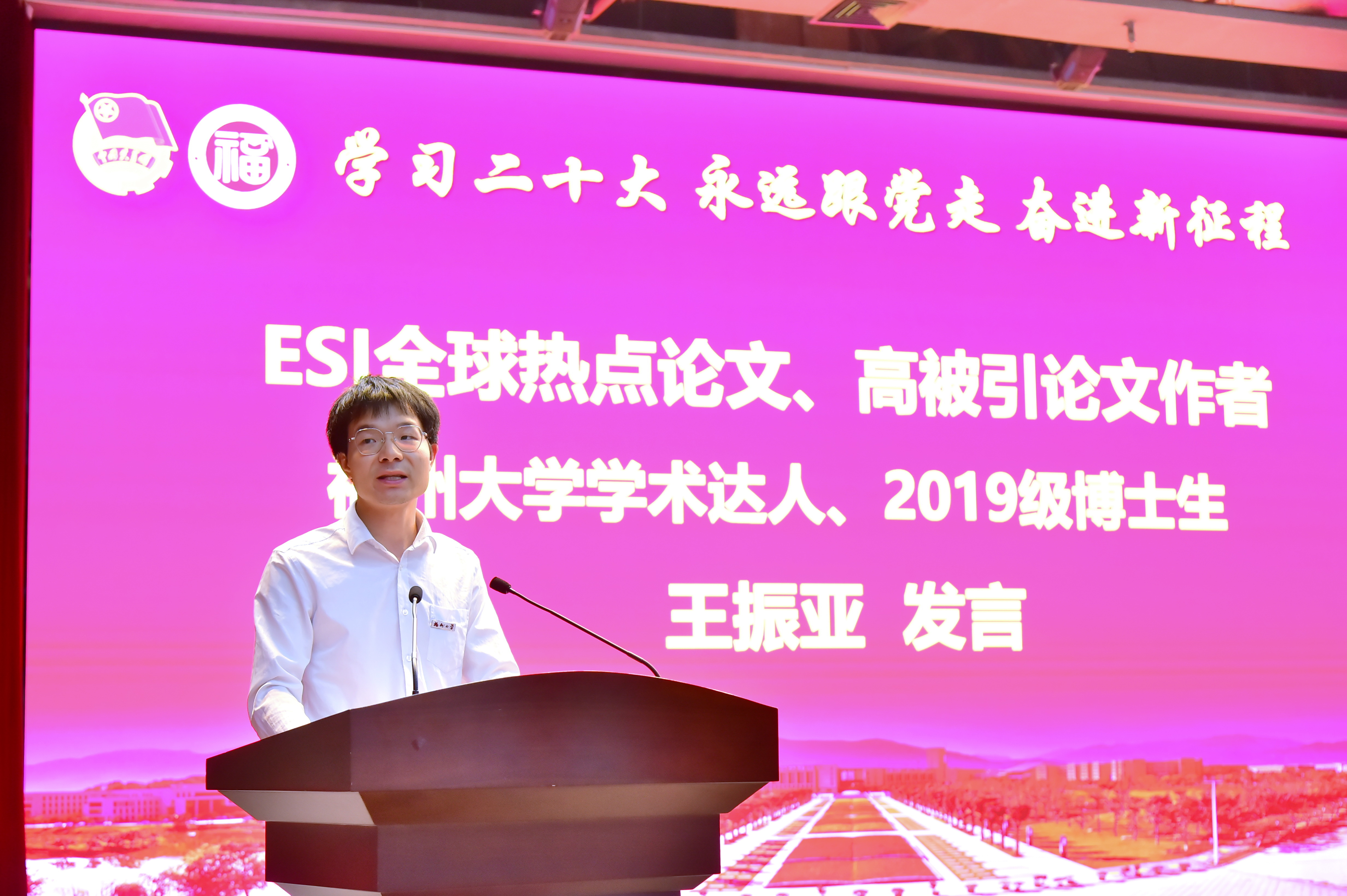 ESI全球热点论文、高被引论文作者,福州大学学术达人、2021和2022年博士研究生国家奖学金获得者王振亚同学分享了自己在学习和科研方面的心得体会。他勉励同学们肩负起时代赋予的责任和使命,用青春和使命把论文写在祖国大地上。