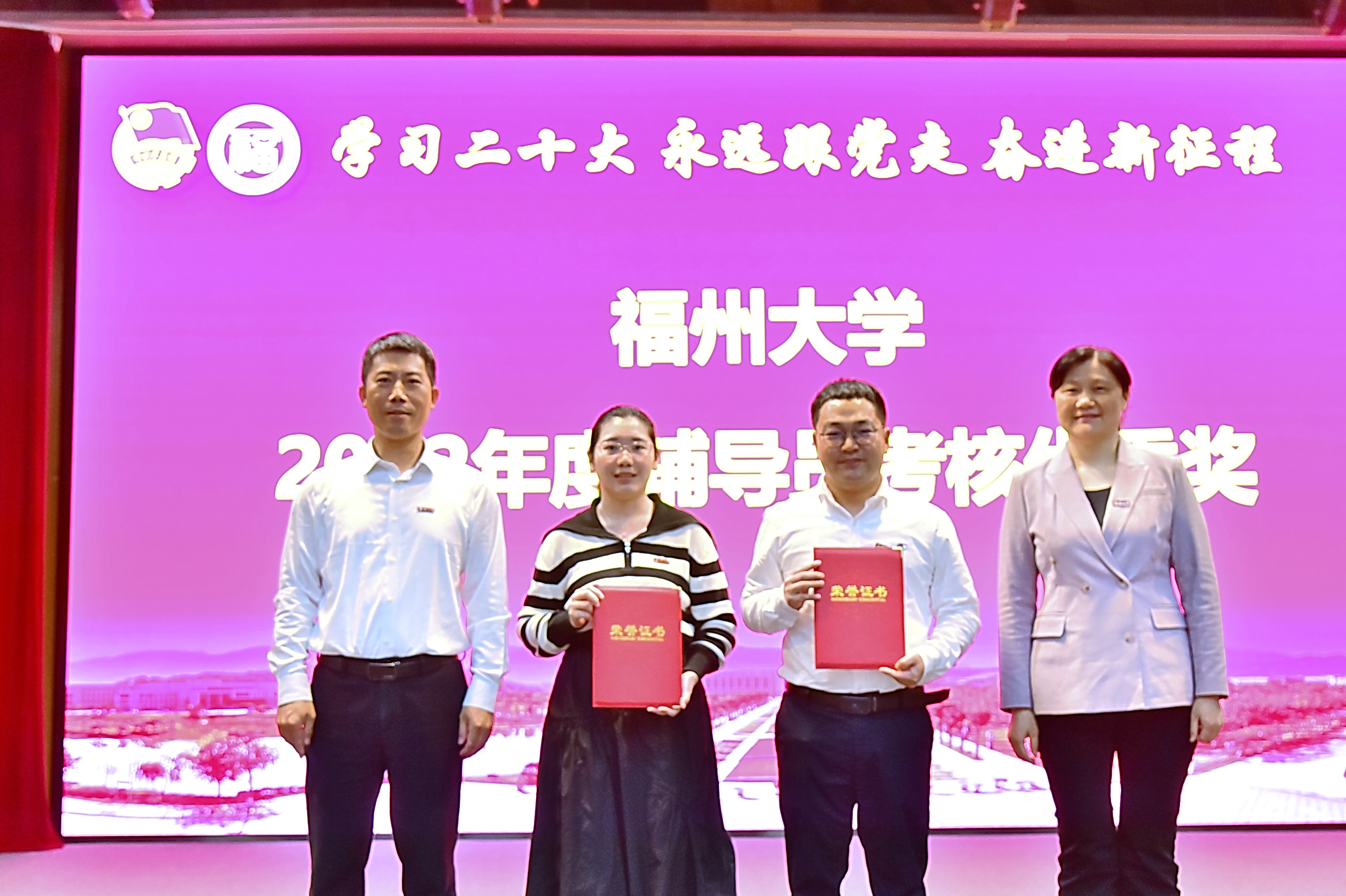 院党委副书记(主持工作)叶青,校人事处处长、学院院长、博士生导师钟舜聪教授为福州大学2022年度辅导员考核优秀奖颁奖