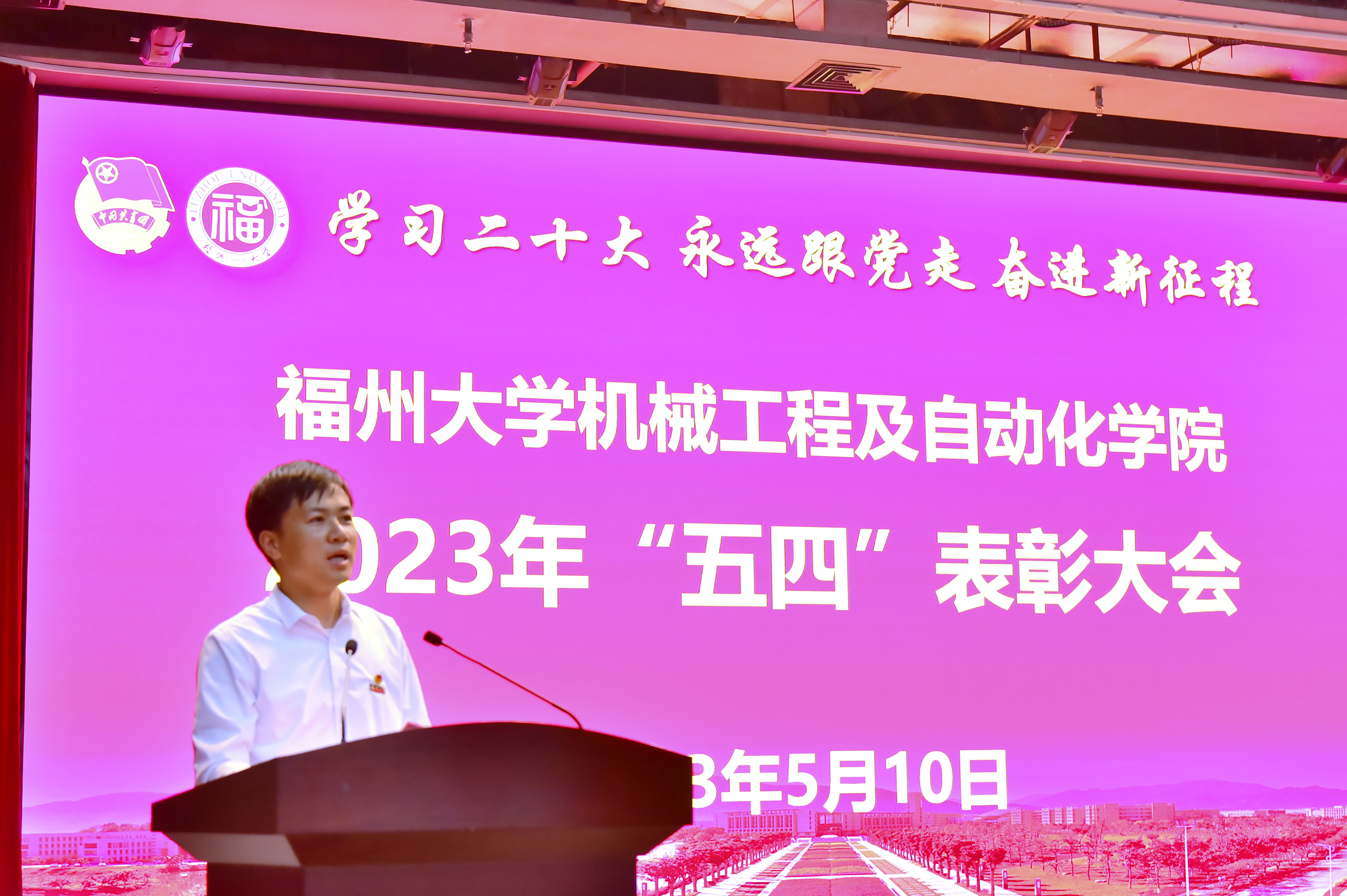 福州大学五四青年奖章集体代表、博士生导师杜恒教授分享了自己所在团队在“五四精神”的激励下,发扬“一代接着一代干,数十年如一日,将一张蓝图绘到底”的精神,勇攀科技高峰的先进事迹。他用习近平总书记在2023年新年贺词中提到的“明天的中国,奋斗创造奇迹”,激励全院青年师生要有愚公移山的志气和滴水穿石的毅力,脚踏实地、埋头苦干,用奋斗创造更美好的明天。